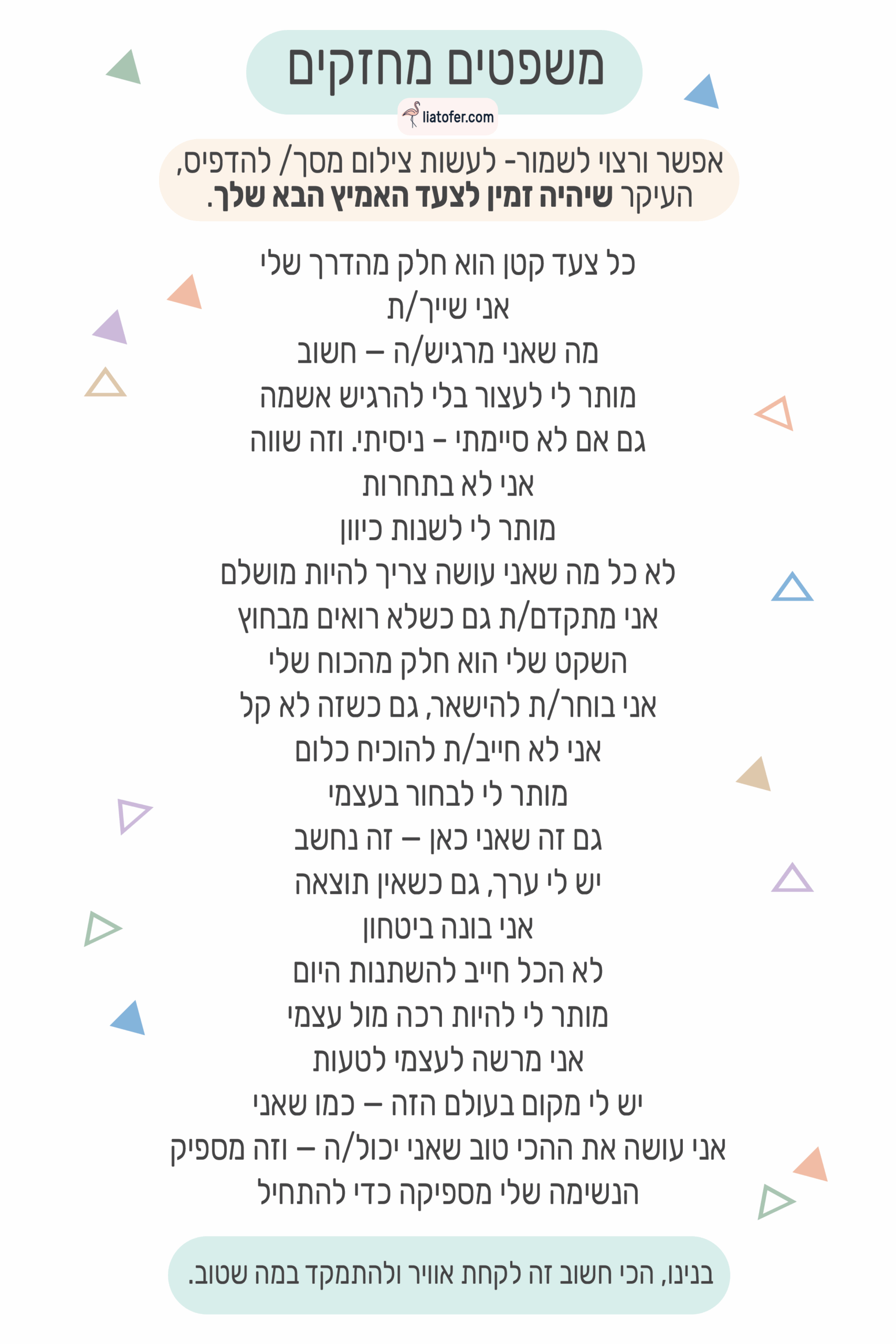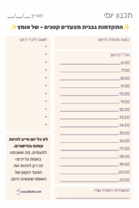 תמשיכו לגלול… מחכים לך משפטים מחזקים, תכנון יומי ושבועי מעצימים – כאלה ששווה לשמור, להדפיס ולהחזיק קרוב – כדי ללוות אותך בצעד האמיץ הבא שלך.