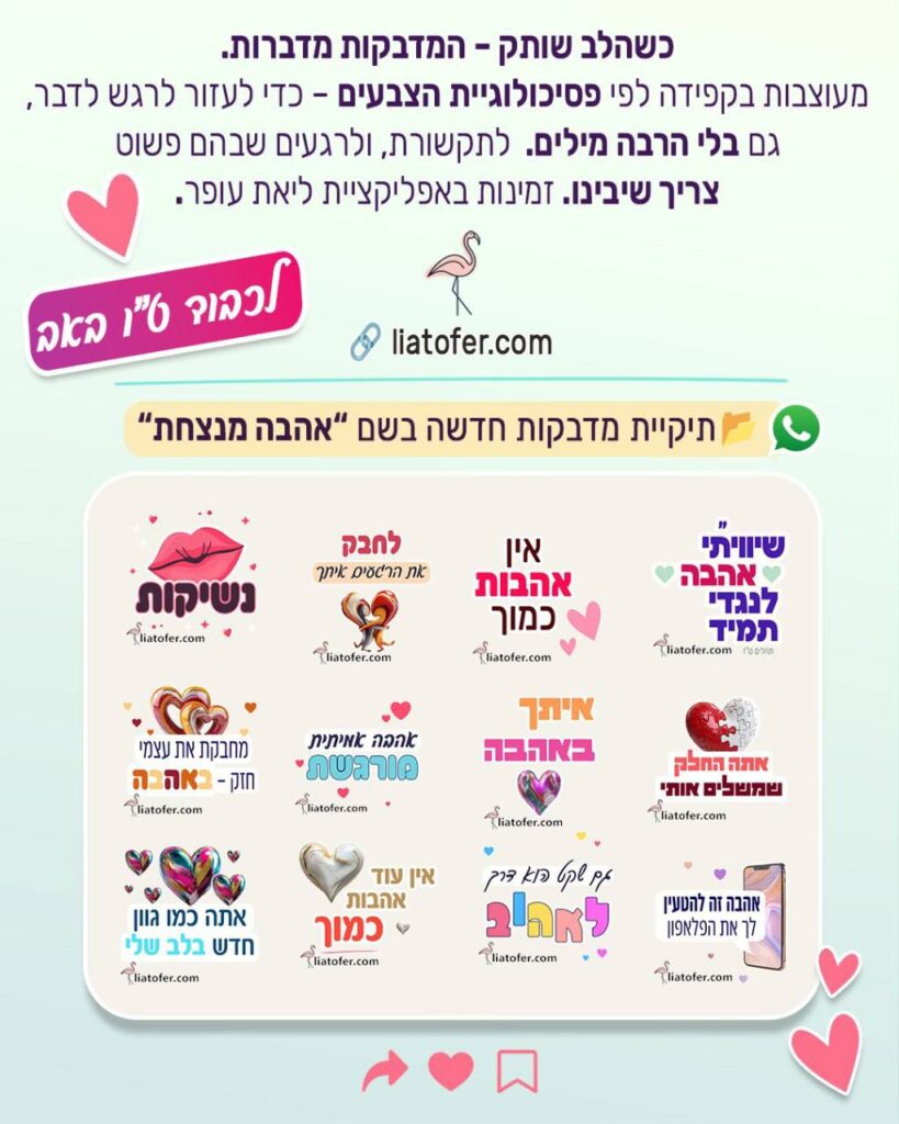 מדבקות אהבה מעוצבות לשליחה אישית, קבוצתית או טיפולית מחפשים מדבקות לוואטסאפ שירגשו באמת?תיקיית "אהבה מנצחת" היא תיקיית מדבקות מעוצבת בקפידה, בהשראת ט״ו באב, אהבה אמיתית ועל פי עקרונות פסיכולוגיית הצבעים. המדבקות בתיקייה נוצרו במיוחד כדי להעביר רגש – בלי צורך להסביר יותר מדי.בין אם אתם מחפשים מדבקות אהבה להורים, בני זוג או חברים, או אם […]