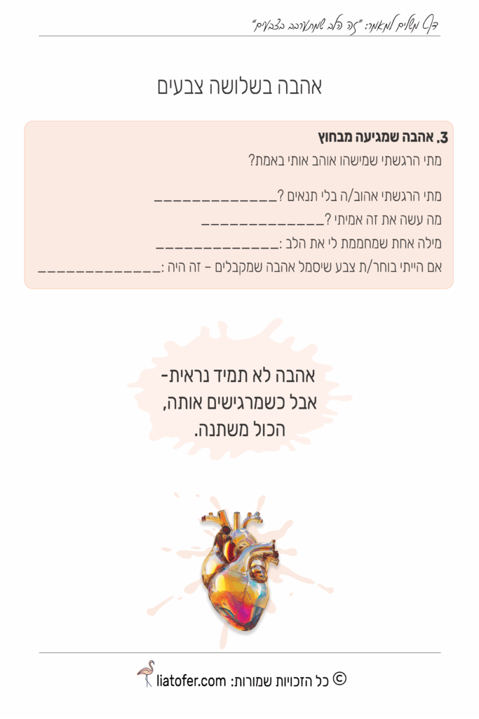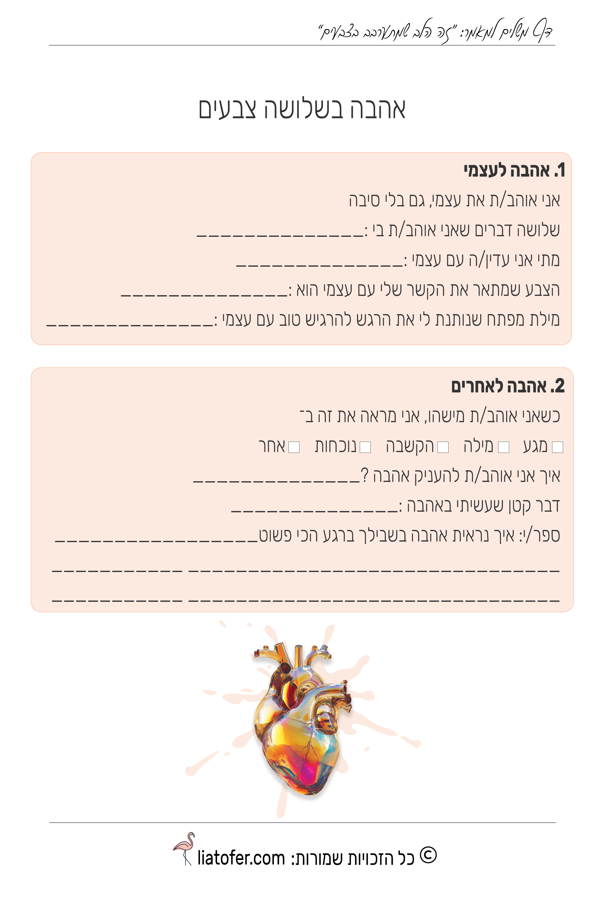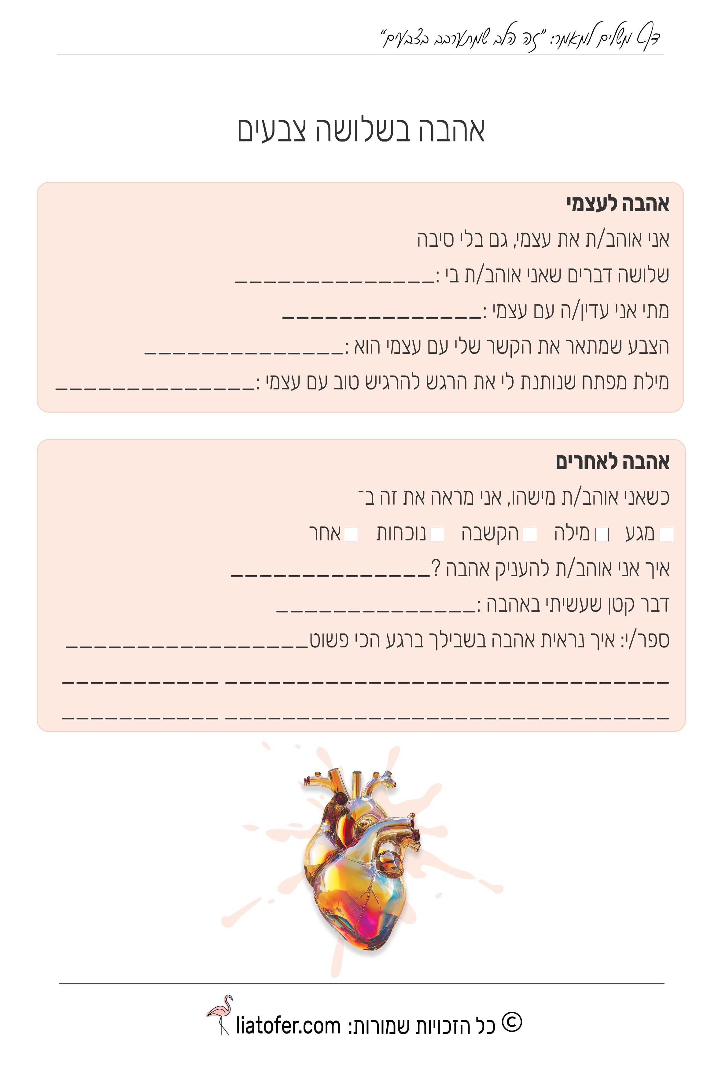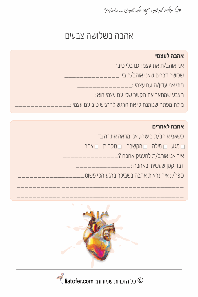 הדפים האלו הם ההמשך למאמר “זה הלב שמתערבב בצבעים” – תוכלו להעמיק, לתרגל וליישם את הרעיונות דרך דפי הפעילות המצורפים.