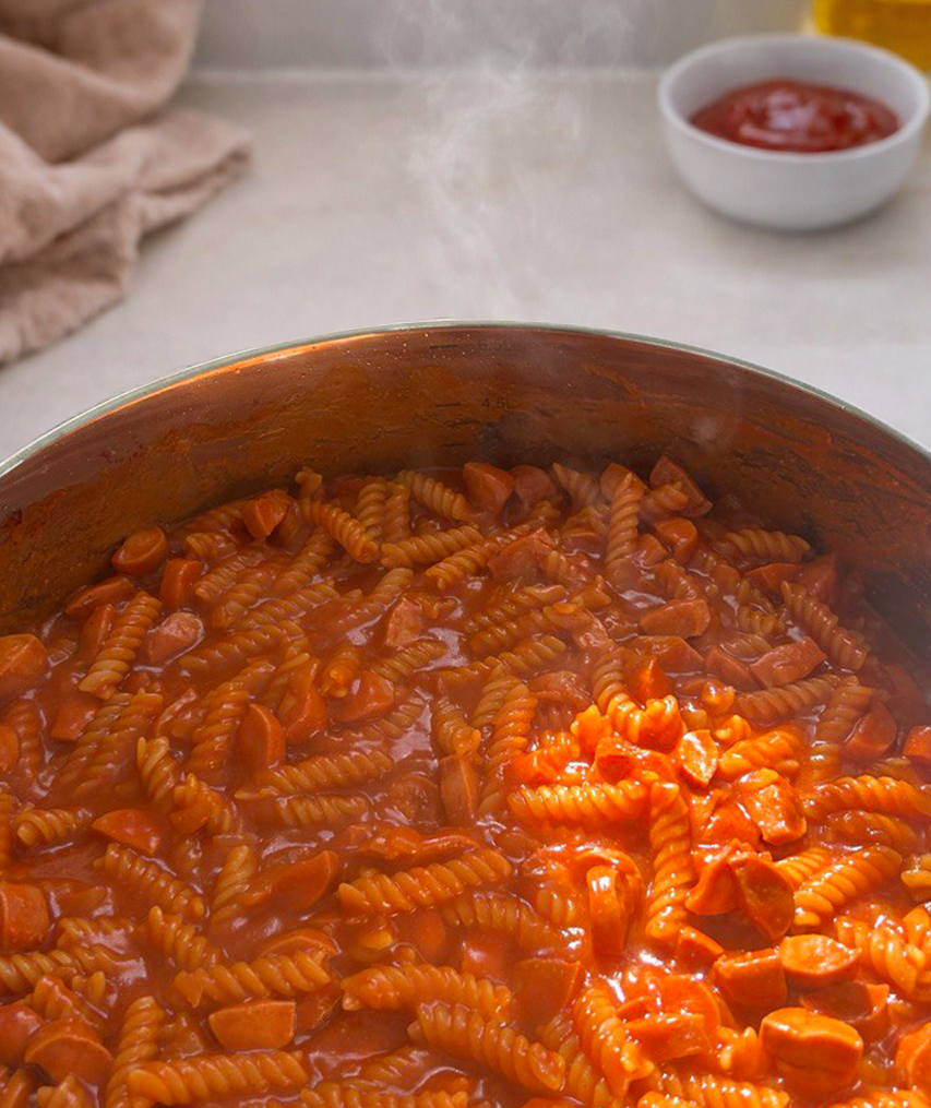 הרוטב מתבשל יחד עם הפסטה, נספג פנימה ויוצר טעמים עשירים בלי שלבים מסובכים.