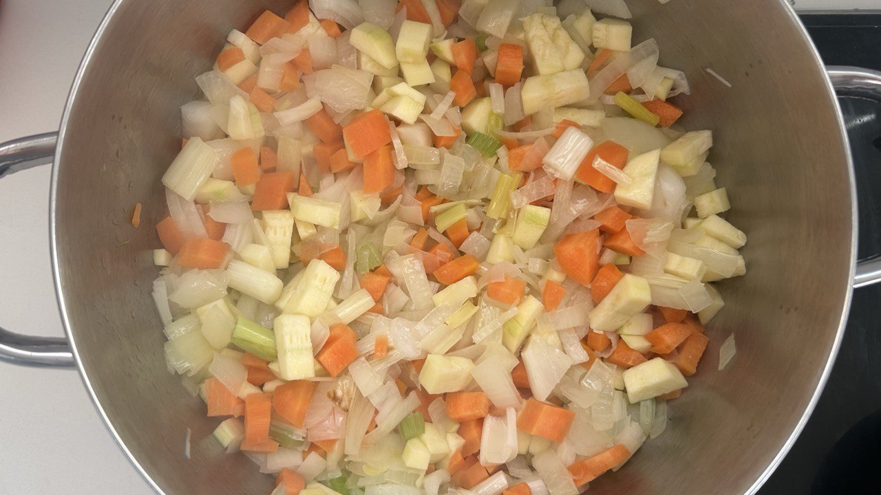 מחממים מעט שמן בסיר גדול ומטגנים את כל הירקות עד שהבצל נהיה שקוף.